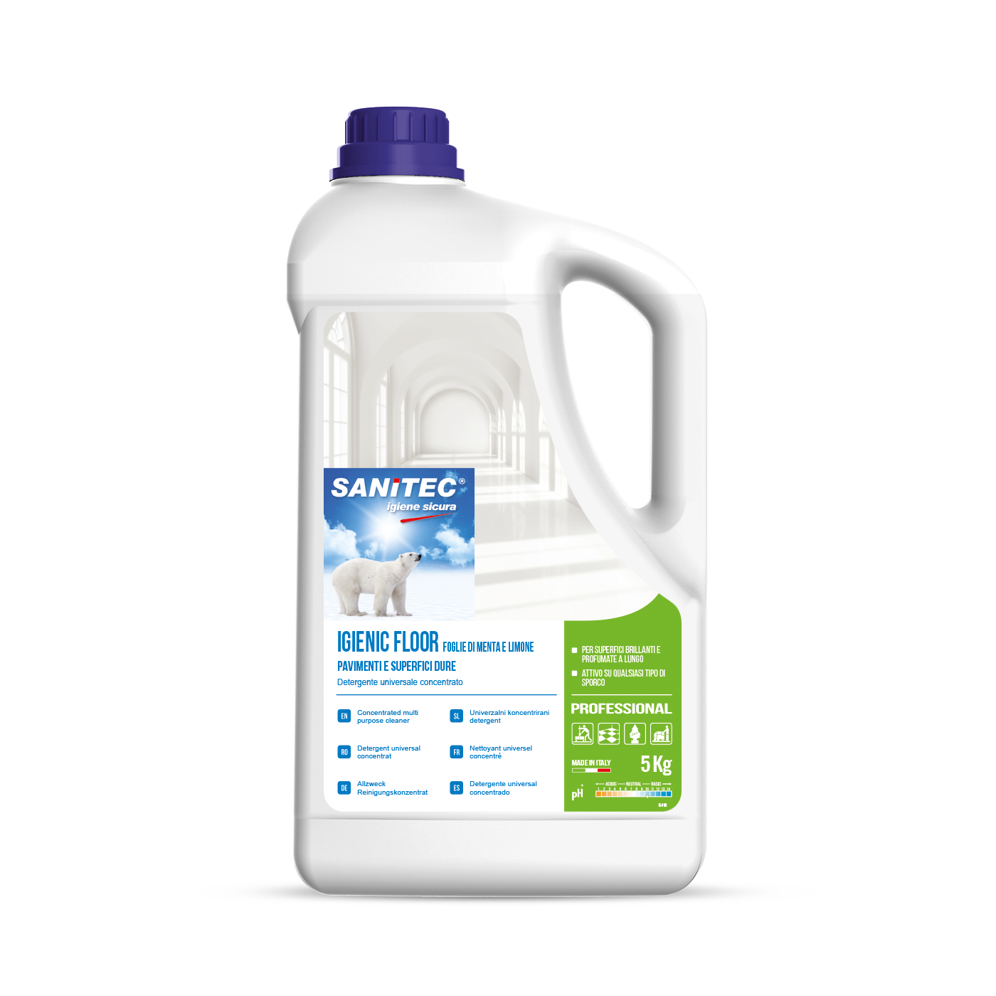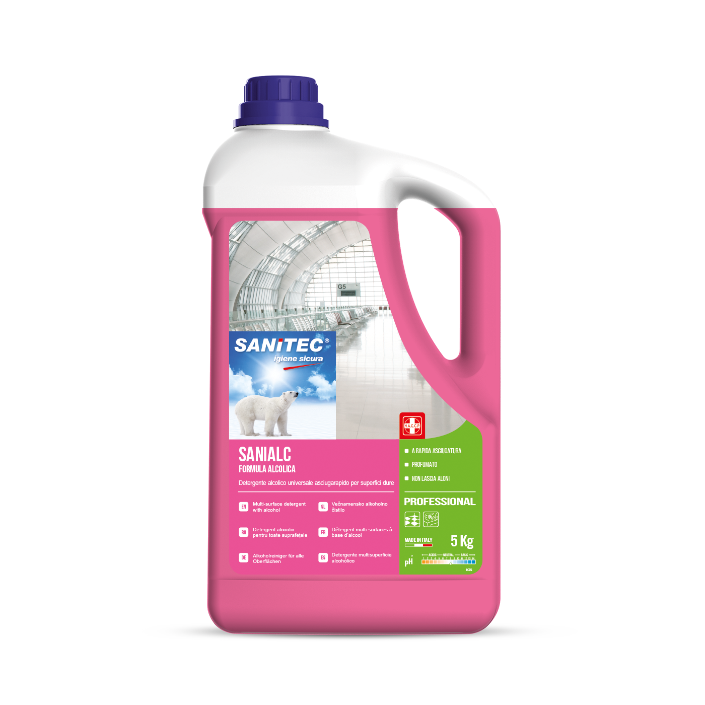 SANIALC Detergente universale profumato a base alcolica, asciuga rapidamente e sgrassa a fondo senza lasciare aloni. Idoneo ai piani HACCP.