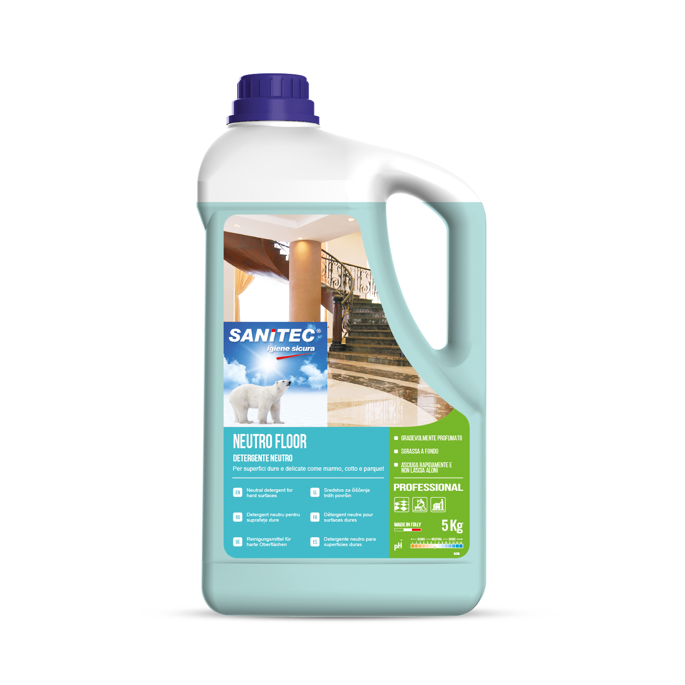 NEUTRO FLOOR Detergente a pH neutro per la pulizia dei pavimenti più delicati. Non aggredisce la cera, non opacizza le superfici lasciando i pavimenti particolarmente brillanti. Igienizza lasciando l’ambiente gradevolmente profumato.