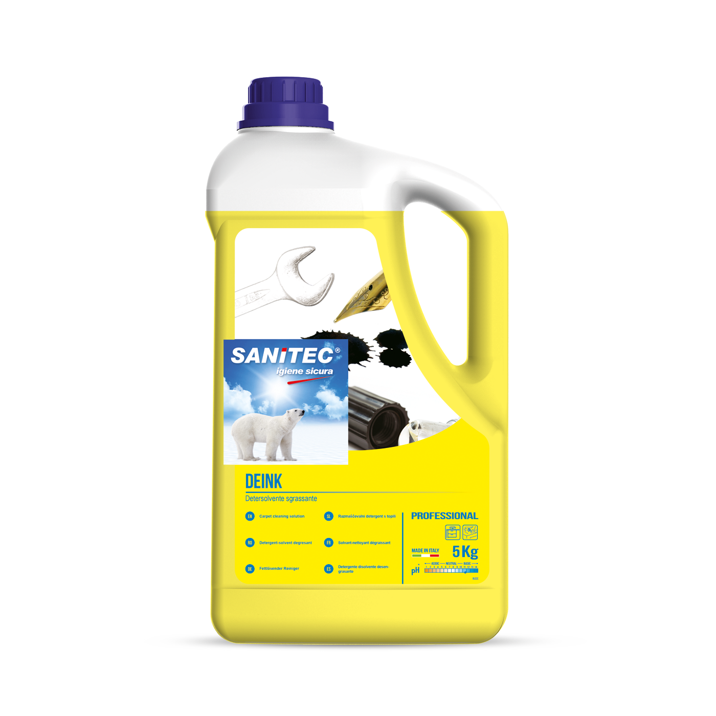 DEINK Detergente sgrassante profumato a base di solventi specifico per la pulizia senza risciacquo e senza aloni di segni di penna, pennarello indelebile, inchiostro, timbri, graffiti, unto, grasso, colla.